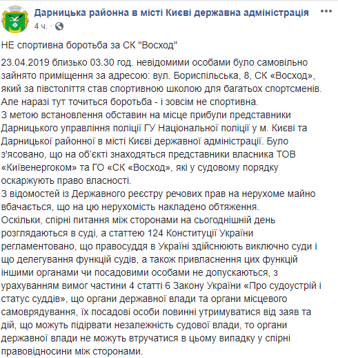 По данному факту правоохранители начали производство по ст. 206-2 (противоправное завладение имуществом предприятия, учреждения, организации) УК. Сейчас правоохранители несут службу вокруг спортклуба. В то же время Дарницкая РГА сообщает, что на объекте находились представители владельца ООО "Киевэнергоком", которые сообщили о начале проведения реконструкции имущества, и ОО "СК "Восход", которые в судебном порядке оспаривают право собственности.