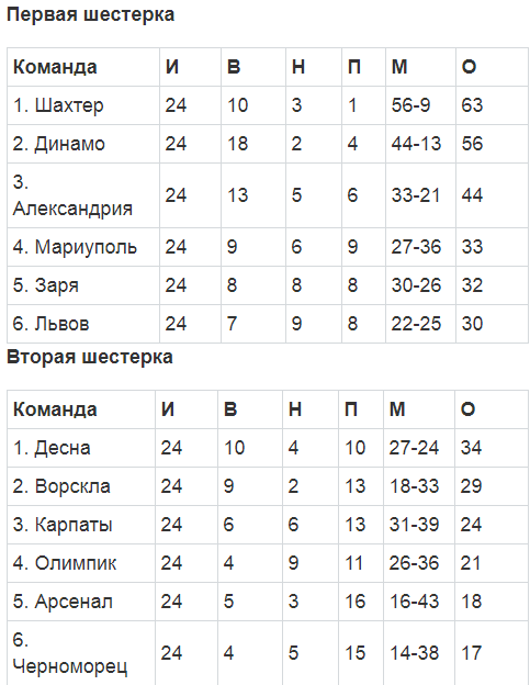 И - игры, В - выигрыши, Н - ничьи, П - поражения, М - мячи, О - очки.