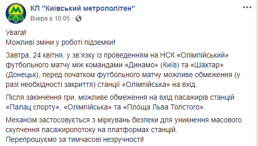 17:28 На время матча в Киеве по соображениям безопасности может быть изменена работа метро в районе стадиона - станции Олимпийская, Льва Толстого, Дворец спорта.