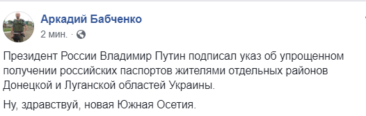 "Ну, здравствуй, новая Южная Осетия", - комментирует раздачу паспортов журналист Аркадий Бабченко.