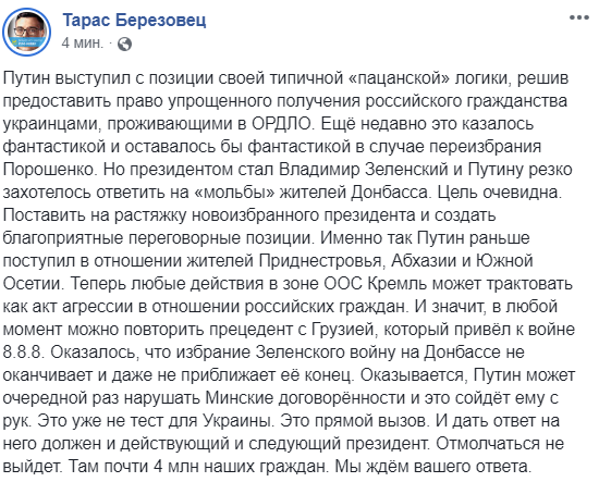 "Ещё недавно это казалось фантастикой и оставалось бы фантастикой в случае переизбрания Порошенко. Но президентом стал Владимир Зеленский и Путину резко захотелось ответить на "мольбы" жителей Донбасса. Цель очевидна. Поставить на растяжку новоизбранного президента и создать благоприятные переговорные позиции. Именно так Путин раньше поступил в отношении жителей Приднестровья, Абхазии и Южной Осетии. Теперь любые действия в зоне ООС Кремль может трактовать как акт агрессии в отношении российских граждан. И значит, в любой момент можно повторить прецедент с Грузией, который привёл к войне 8.8.8", - пишет в ФБ политолог Тарас Березовец.