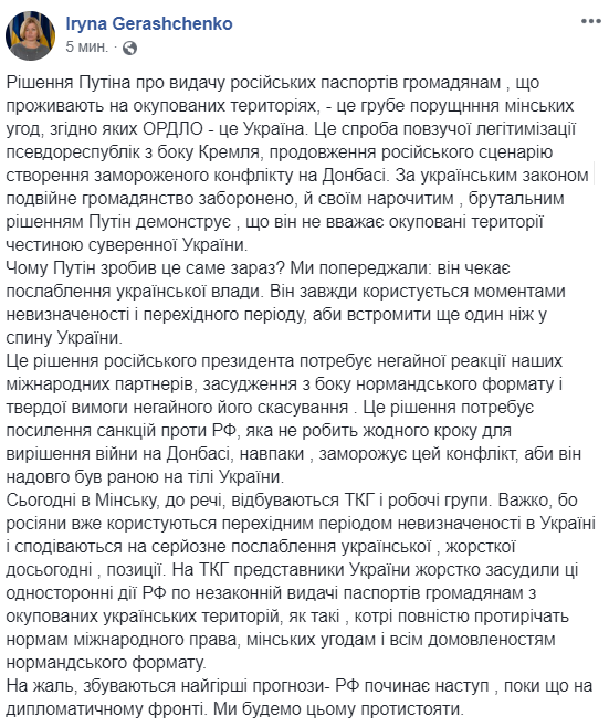 "Это попытка ползучей легитимизации псевдореспублик со стороны Кремля, продолжение российского сценария создания замороженного конфликта на Донбассе", - написала Геращенко в Facebook.