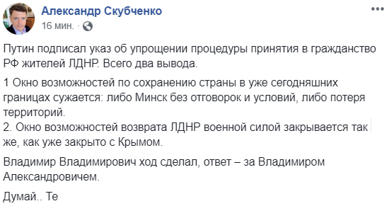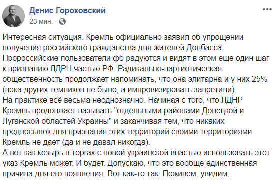 "Интересная ситуация. Кремль официально заявил об упрощении получения российского гражданства для жителей Донбасса. Пророссийские пользователи фб радуются и видят в этом еще один шаг к признанию ЛДРН частью РФ. Радикально-партиотическая общественность продолжает напоминать, что она элитарна и у них 25% (пока других темников не было, а импровизировать запретили).