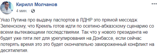 "Указ Путина про выдачу паспортов в ЛДНР - это прямой месседж Зеленскому, что Кремль готов идти по осетино-абхазскому сценарию со всеми вытекающими последствиями. Так что у нового президента не будет уже пяти лет для урегулирования на Донбассе, если сейчас потерять время это это будет окончательно замороженный конфликт на десятилетия", - считает журналист Кирилл Молчанов.