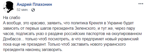 "А вообще это красиво, заявить, что политика Кремля в Украине будет зависеть от первых шагов президента Зеленского, и тут же, через пару часов, подписать указ о раздаче российских паспортов на оккупированном Донбассе... только чтоб посмотреть, а что предпримет новый украинский пока еще не президент. Только чтоб заставить нового украинского президента наконец заговорить", - считает блогер Андрей Плахонин.