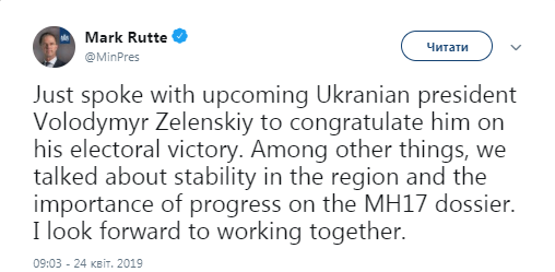 "Только что поговорил с будущим президентом Украины Владимиром Зеленским, поздравил его с победой на выборах. Среди других вещей мы говорили о стабильности в регионе и важности прогресса в деле MH17. Я ожидаю нашей совместной работы", - написал Марк Рютте.