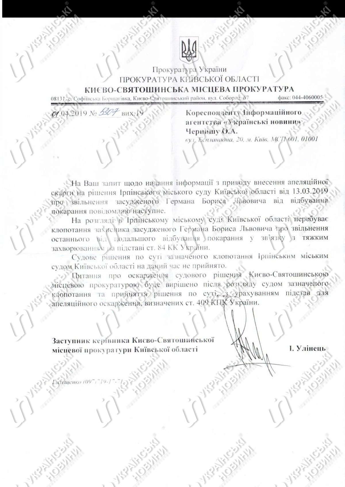 "Вопрос об обжаловании судебного решения Киево-Святошинской местной прокуратурой будет решен после рассмотрения судом указанного ходатайства и принятия решения по существу, учитывая основания для апелляционного обжалования, определенные ст. 409 УПК", - заявили в прокуратуре.