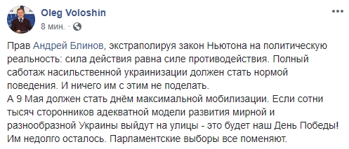 Он же придумал, как нужно реагировать на происходящее: "Полный саботаж насильственной украинизации должен стать нормой поведения. И ничего им с этим не поделать. А 9 Мая должен стать днём максимальной мобилизации. Если сотни тысяч сторонников адекватной модели развития мирной и разнообразной Украины выйдут на улицы - это будет наш День Победы! Им недолго осталось. Парламентские выборы все поменяют".