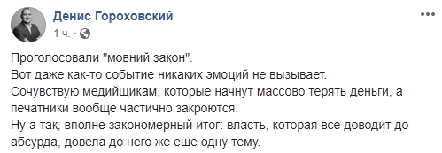 Блогер Денис Гороховский: "Проголосовали "мовний закон". Вот даже как-то событие никаких эмоций не вызывает.