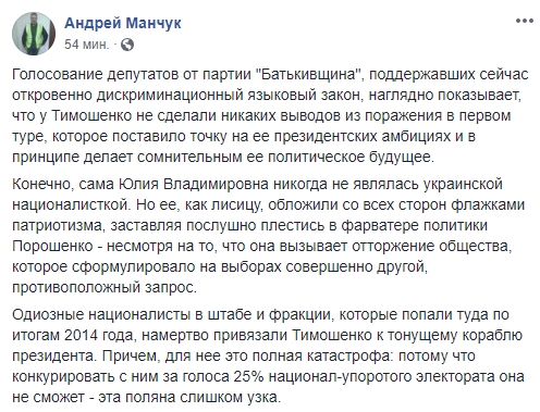 Журналист Андрей Манчук пишет: "Голосование депутатов от партии "Батькивщина", поддержавших сейчас откровенно дискриминационный языковый закон, наглядно показывает, что у Тимошенко не сделали никаких выводов из поражения в первом туре, которое поставило точку на ее президентских амбициях и в принципе делает сомнительным ее политическое будущее.
