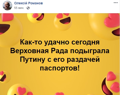 Блогер Алексей Романов отмечает: "Как-то удачно сегодня Верховная Рада подыграла Путину с его раздачей паспортов!"