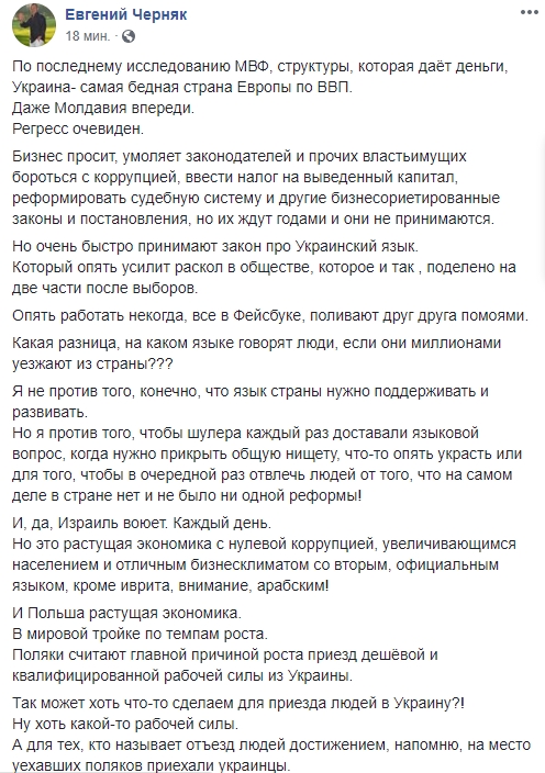Если разочаровал кого-то извините, понимаю ваше желание верить в лучшее или жить в иллюзиях, но иллюзии плохая штука. Находясь в иллюзиях, ты все время идёшь не туда! Давайте уже займёмся экономикой. Это точно всех объединит. Средней зарплатой, например, в 1 тысячу Евро. Вот отличная задача на ближайшие пять лет. И возврат убежавших от таких законов Граждан Украины, которые прямо сейчас делают другие страны сильнее. Другие страны. Но не Украину".