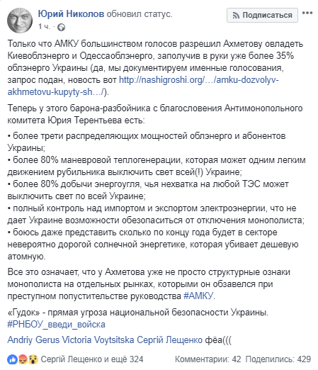 "В итоге Ахметов владеет 35% облэнерго страны. Это в дополнение к ранее согласованным ему антимонопольным: трети распределительных мощностей, 80% маневровой теплогенерации, 80% добычи электроугля, полному контролю экспорта и импорта электроэнергии. Вот она настоящая элита, а не "группа 25%"", - написал Шабунин.