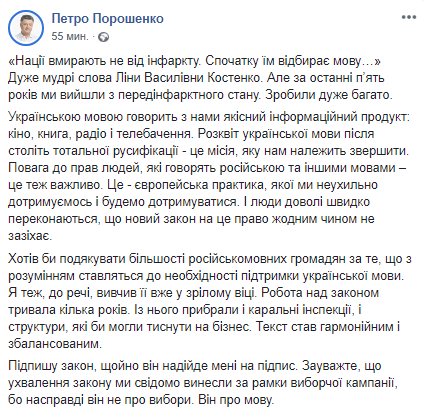 "Хотел бы поблагодарить большинство русскоязычных граждан за то, что с пониманием относятся к необходимости поддержки украинского языка. Я тоже, кстати, изучил его уже в зрелом возрасте. Работа над законом продолжалась несколько лет. Из него убрали и карательные инспекции и структуры, которые бы могли давить на бизнес. Текст стал гармоничным и сбалансированным", - сказал Петр Порошенко.