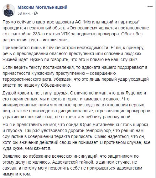 Он добавляет, что если верить тексту постановления, то адвоката адвокатского объединения подозревают в причастности к ужасному преступлению – совершению террористического акта. "Убежден, что это лишь первый удар уходящей власти по нашему Объединению", - пишет Могильницкий.