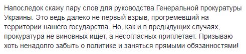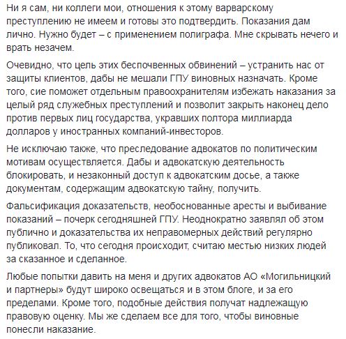 Адвокат пишет, что ни он сам, ни его коллеги, отношения к этому варварскому преступлению не имеют и готовы это подтвердить. "Показания дам лично. Нужно будет – с применением полиграфа. Мне скрывать нечего и врать незачем", - поясняет юрист.