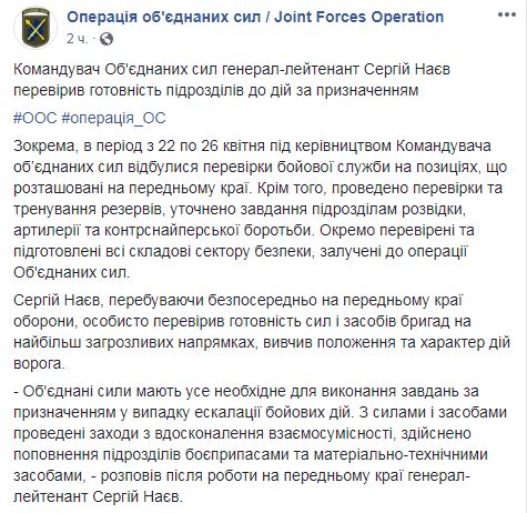 "Объединенные силы имеют все необходимое для выполнения задач по назначению в случае эскалации боевых действий", - заявил Наев. Он добавил, что подразделения ВСУ получили пополнение боеприпасов и материально-технических средств.