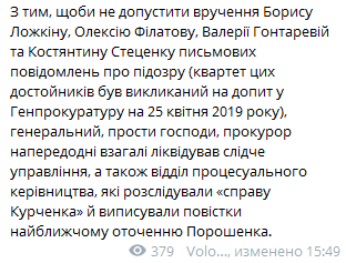 "С тем, чтобы не допустить вручения Борису Ложкину, Алексею Филатову, Валерии Гонтаревой и Константину Стеценко письменных сообщений о подозрении (квартет этих достойных был вызван на допрос в Генпрокуратуру на 25 апреля 2019), генеральный...прокурор накануне вообще ликвидировал следственное управление, а также отдел процессуального руководства, которые расследовали "дело Курченко" и выписывали повестки ближайшему окружению Порошенко", - написал он.