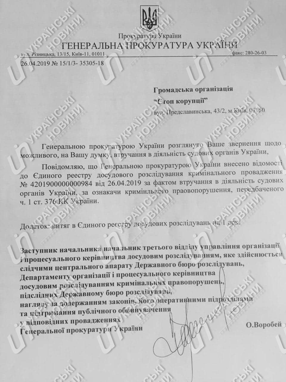 Отмечается, что дело открыто по обращению общественной организации "Стоп коррупции". Уголовное производство было начато по части 1 статьи 376 (вмешательство в деятельность судебного органа) Уголовного кодекса.