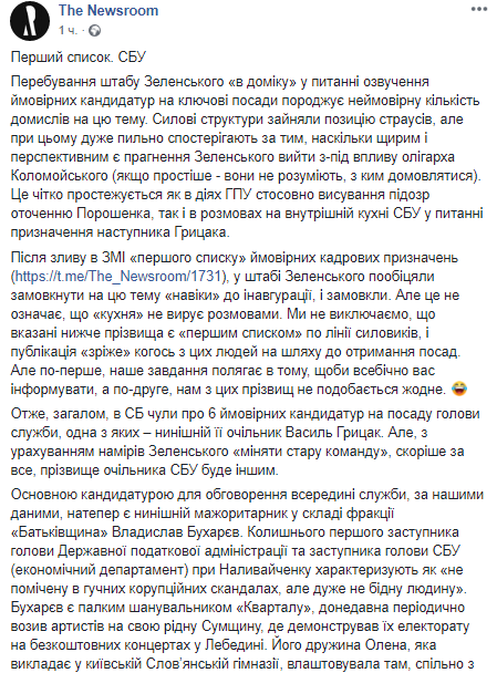 "...В целом в СБ слышали о 6 возможных кандидатур на должность главы службы, одна из которых - нынешний ее руководитель Василий Грицак. Но, с учетом намерений Зеленского "менять старую команду", скорее всего, фамилия главы СБУ будет другим", - сказано в сообщении.