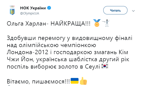 В субботу, 27 апреля, украинская саблистка Ольга Харлан выиграла первый турнир сезона и первый отборочный турнир на Олимпийские игры-2020 - Гран-при Сеула в Южной Корее. Об этом в Twitter сообщает НОК Украины.