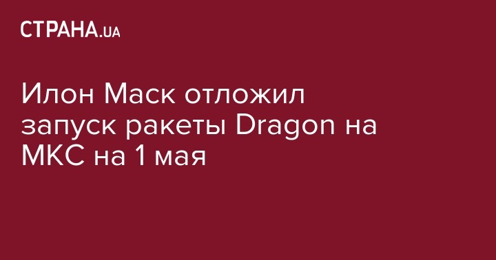 В США перенесли запуск космического корабля Dragon компании Илона Маска SpaceX. Новый старт запланирован на 1 мая. Об этом сообщается в Twitter.