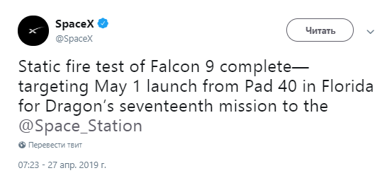 По данным SpaceX, перед запуском ракеты Falcon 9, которая готовится к пуску, завершили статические огневые испытания.  Старт семнадцатой миссии Dragon запланирован на базе ВВС США во Флориде.