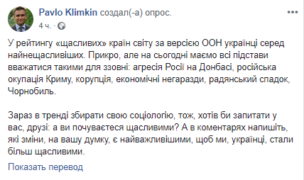 "В рейтинге "счастливых" стран мира по версии ООН украинцы среди самых несчастных. Жаль, но сегодня есть все основания считаться такими извне: агрессия России на Донбассе, российская оккупация Крыма, коррупция, экономические проблемы, советское наследие, Чернобыль",- написал Павел Климкин.