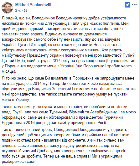 "Так вот, новоиспеченный тролль, Владимир Владимирович, я достаточно опытен чтобы за этими маневрами видеть приёмы вашей политики двойных стандартов - требовать от оппонента, который так сильно вам ответил своим заявлением на вашу раздачу российских паспортов на оккупированной части Донбасса, моего возвращения, надеясь, что он побоится это сделать. Теперь это не ваше дело! Мы с украинцами разберемся сами!", - заявил Саакашвили.
