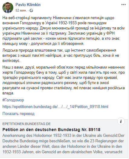 "На веб-странице парламента Германии появилась петиция о признании Голодомора в Украине 1932-1933 годов геноцидом украинского народа. Спасибо мюнхенской общине за инициативу и всем украинцам Германии за ее поддержку. Призываю украинцев во всем мире поддержать этот призыв - каждый может подписать петицию, а кто знает немецкий язык - присоединиться к ее обсуждению", - сказано в заявлении.