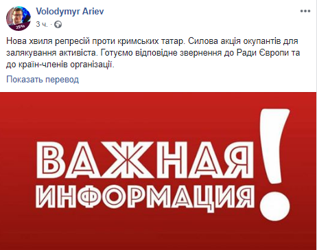 "Новая волна репрессий против крымских татар. Силовая акция оккупантов для запугивания активиста. Готовим соответствующее обращение в Совет Европы и к странам-членам организации", - написал в своем Facebook глава делегации Верховной Рады в ПАСЕ народный депутат Владимир Арьев.