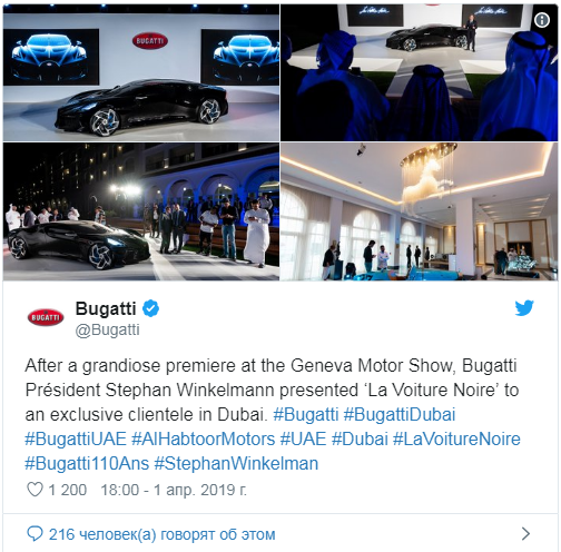Модель бренда La Voiture Noire, которая была представлена в марте 2018 года на автосалоне в Женеве, уже назвали самой дорогой машиной в мире. Ее стоимость 11 миллионов евро. Мощность двигателя автомобиля составляет 1500 лошадиных сил, а его скорость достигает 420 км/ч.