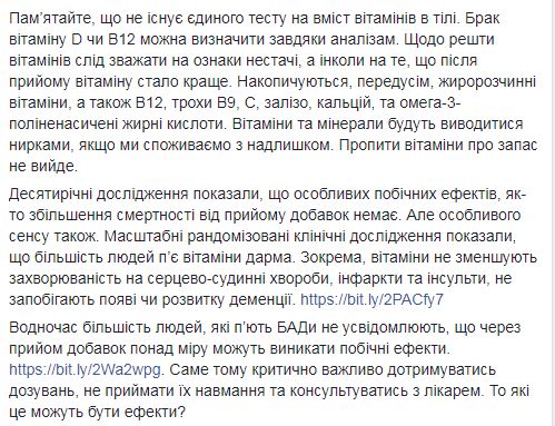 Результат от применения витаминных и биологически-активных добавок может быть не таким, как обещают производители, также могут быть побочные эффекты. Об этом в Facebook сообщила и.о. министра здравоохранения Ульяна Супрун.