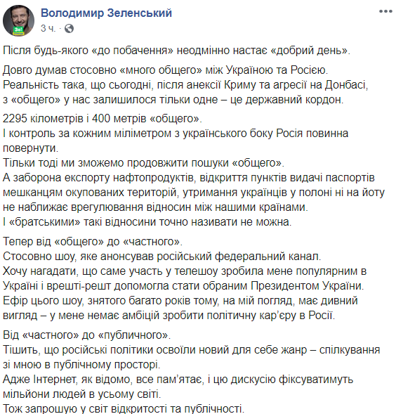 Никак не упоминает этих событий и новоизбранный президент Владимир Зеленский. Сегодня он отметился тем, что встречался с представителями исламской общины Украины. И написал пост в Facebook, что у России с Украиной из общего осталась только граница.