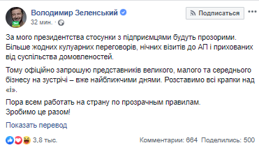 Победивший на выборах президента Украины Владимир Зеленский пообещал, что при его президентстве отношения с предпринимателями будут прозрачнымит и лишенными "кулуарных переговоров, ночных визитов в АП и скрытых от общества договоренностей".