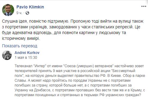 Министр иностранных дел Украины Павел Климкин поддержал идею альтернативной "Бессмертному полку" акции в Украине на 9 мая. Свое мнение по этому поводу Климкин изложил в Facebook.