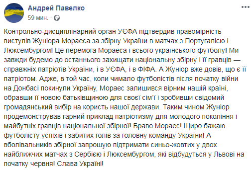 "Это победа Мораеса и всего украинского футбола! Мы всегда будем до последнего защищать национальную сборную и ее игроков - настоящих патриотов Украины, и в УЕФА, и в ФИФА. А Жуниор уже доказал, что является ее патриотом", - говорится на фб-странице президента ФФУ Андрея Павелко.