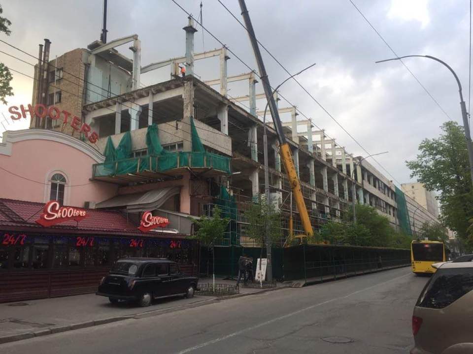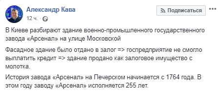 "В Киеве разбирают здание военно-промышленного государственного завода Арсенал на улице Московской. Фасадное здание было отдано в залог. Госпредприятие не смогло выплатить кредит и здание продано как залоговое имущество с молотка", - написал Кава и опубликовал фото с места событий.