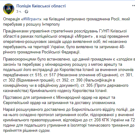 Россиянина подозревают в отмывании денег, фальсификации коммерческих документов и совершении преступления против государственного казначейства. Впоследствии мужчину планируют передать правоохранителям Испании. Задержанного доставили в Бориспольский отдел полиции.