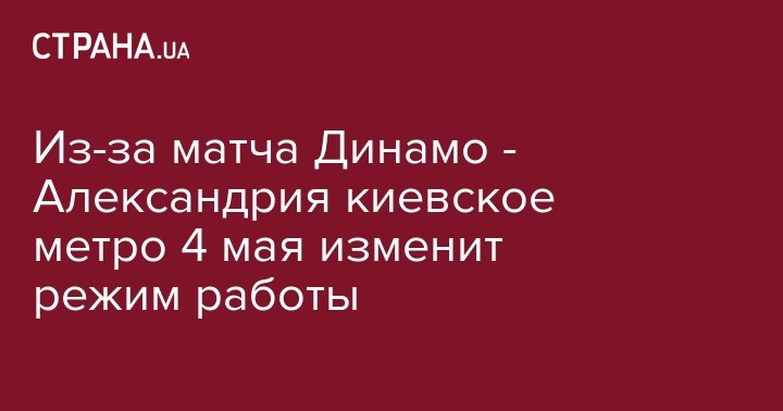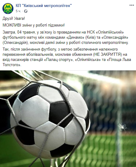 В субботу, 4 мая, киевское метро может изменить режим работы в связи с проведением футбольного матча Динамо - Александрия. Об этом сообщает пресс-служба КП "Киевский метрополитен" на странице в Facebook.