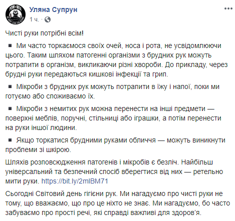 И.о. министра здравоохранения Ульяна Супрун в Facebook снова дает советы украинцам. В этот раз она рассказала, как правильно мыть руки.