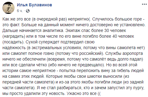 "Как же это все (в очередной раз) неприятно(. Случилось большое горе - это факт. Больше на данный момент ничего достоверно не установлено. Дальше начинается аналитика. Экипаж спас более 30 человек (наградить) или в том числе по его вине погибло более 40 человек (посадить). Сухой суперждет подтвердил свою надёжность (в экстремальных условиях, потому что вины самолета нет) или самолет полное говно (потому что российский). Службы аэропорта ничего не обеспечили (вовремя, потому что самолёт ведь долго падал) или все сделали чётко (ибо ничего не предвещало). Но во всей этой истории самое неприятное - попытка переложить вину за гибель людей на самих этих людей. Которые якобы свои шмотки выносили (из передней части самолета) и из-за этого якобы погибли люди (из задней части самолета). Я не стал разбираться, кто и зачем запустил эту пургу, мы просто удалили эту новость. Ужасно это все".