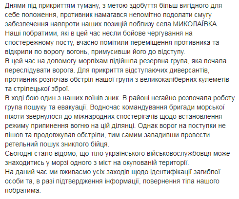 "В ходе боя один из наших воинов исчез. В районе немедленно начала работу группа поиска и эвакуации. В то же время командование бригады морской пехоты обратилось к международным наблюдателям по установлению режима прекращения огня на этом участке. Однако враг на уступки не пошел и продолжал обстрелы, тем самым помешав провести тщательный поиск пропавшего бойца", – подчеркнули в 35 отдельной бригаде морской пехоты.