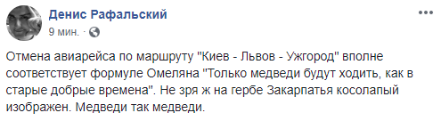 Журналист "Страны" Денис Рафальский отметил, что "отмена авиарейса по маршруту Киев-Львов-Ужгород" вполне соответствует формуле Омеляна "Только медведи будут ходить, как в старые добрые времена". "Не зря ж на гербе Закарпатья косолапый изображен. Медведи так медведи", - добавил Денис Рафальский.