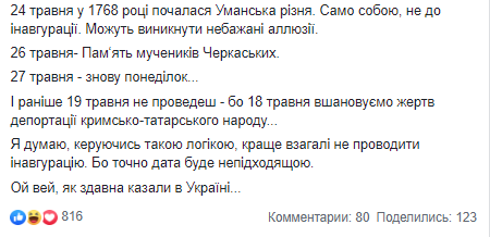 Политолог Константин Бондаренко написал, что руководствуясь логикой тех, кто выступает против даты инаугурации 19 мая, лучше вообще не проводить церемонию, поскольку любая дата будет неподходящей.