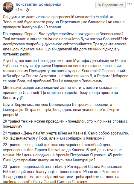 "Две мысли не дают покоя прогрессивному меньшинству в Украине: как Зеленский будет класть руку на Пересопницкое Евангелие и можно проводить инаугурацию 19 мая.