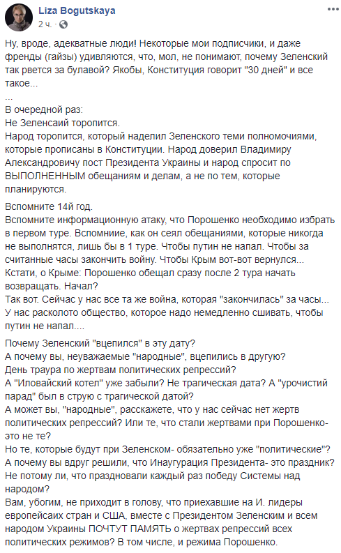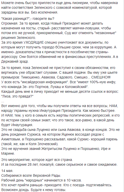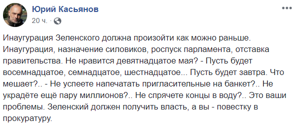 "Инаугурация Зеленского должна произойти как можно раньше. Инаугурация, назначение силовиков, роспуск парламента, отставка правительства. Не нравится девятнадцатое мая? - Пусть будет восемнадцатое, семнадцатое, шестнадцатое... Пусть будет завтра. Что мешает?.. - Не успеете напечатать пригласительные на банкет?.. Не украдёте ещё пару миллионов?.. Не спрячете концы в воду?.. Это ваши проблемы. Зеленский должен получить власть, а вы - повестку в прокуратуру", - считает волонтер Юрий Касьянов.