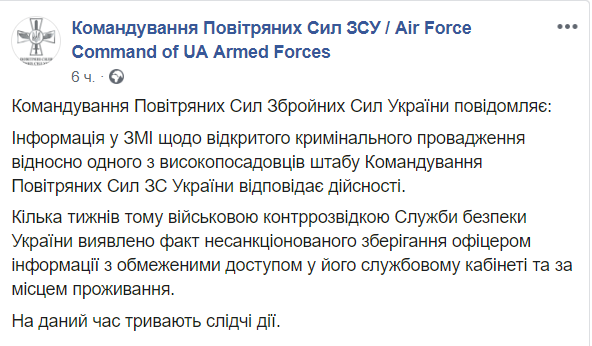 Командование Воздушных сил Вооруженных сил Украины подтвердило информацию об открытии уголовного производства против одного из высокопоставленных офицеров штаба Командования ВС ВСУ по факту несанкционированного хранения ним данных с ограниченным доступом. Об этом сообщается на странице Командования Воздушных сил Facebook.