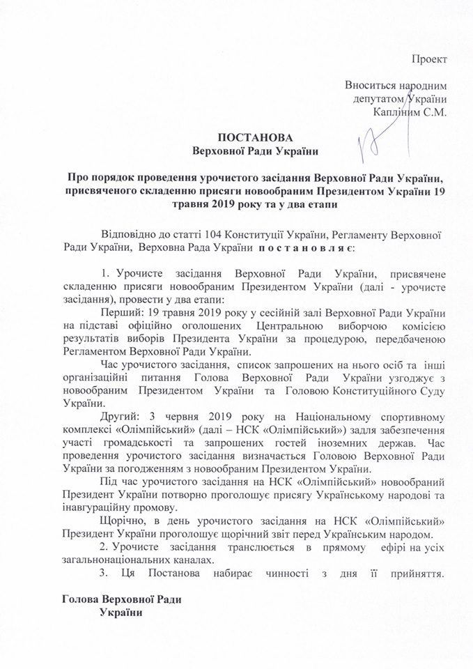 Согласно предложению Каплина, первый этап инаугурации должен пройти 19 мая в парламенте. Второй этап, протокольный, с участием иностранных гостей - состоится 3 июня на НСК "Олимпийский" или во Дворце Украина.