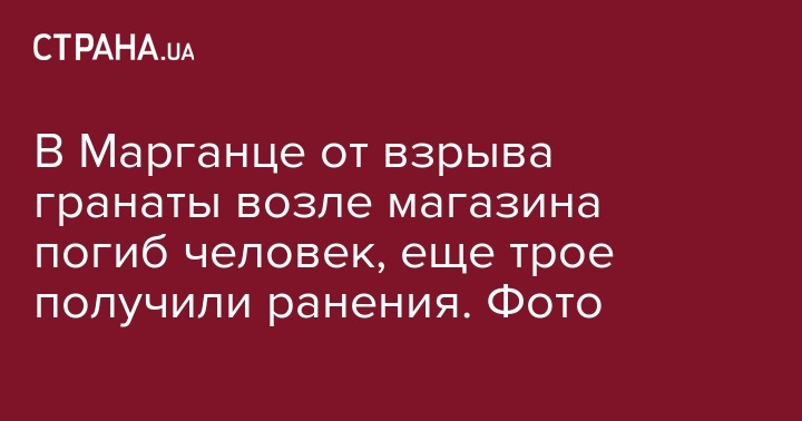 Во вторник, 7 мая, в городе Марганец Днепропетровской области возле здания магазина взорвалась граната, в результате один человек погиб, трое, в том числе патрульный полицейский, получили ранения. Об этом сообщает пресс-служба полиция Днепропетровской области.